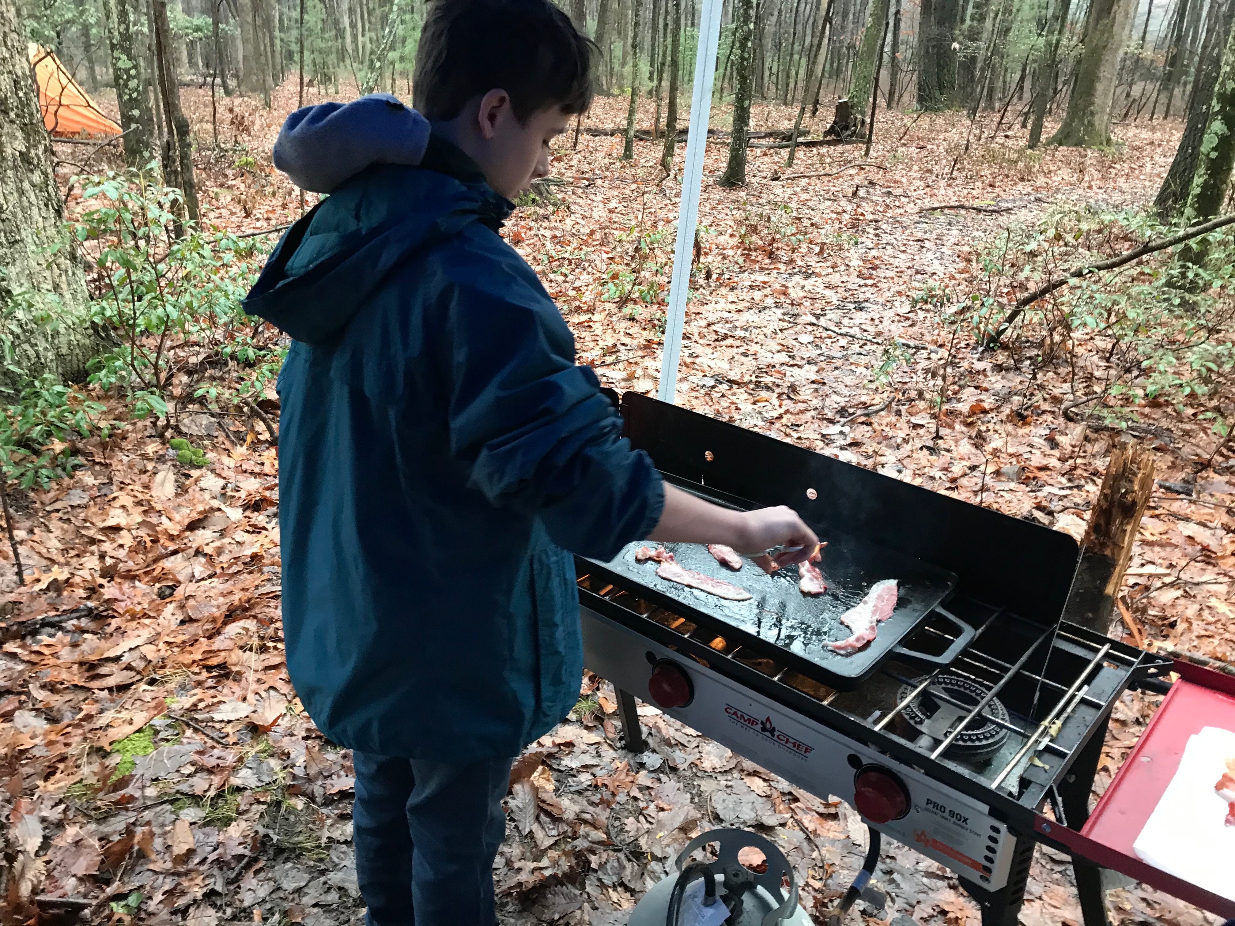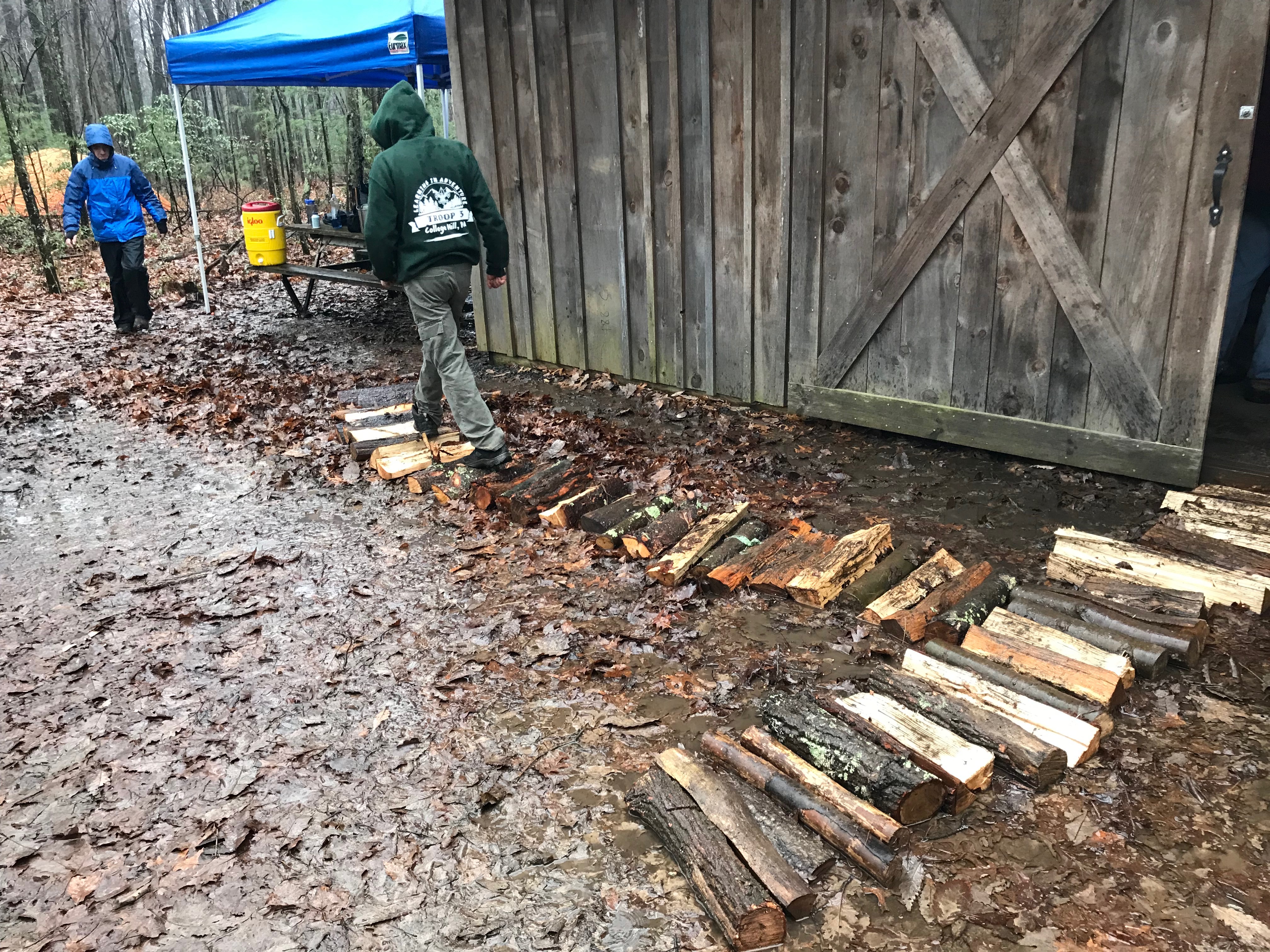 We stayed in the cabin at the Mule Pen and focused on cooking, first aid, knots, lashings, and fire building (as well as the obligatory game of Uno). It rained heavily late Friday into Saturday afternoon, which created a lot of mud.